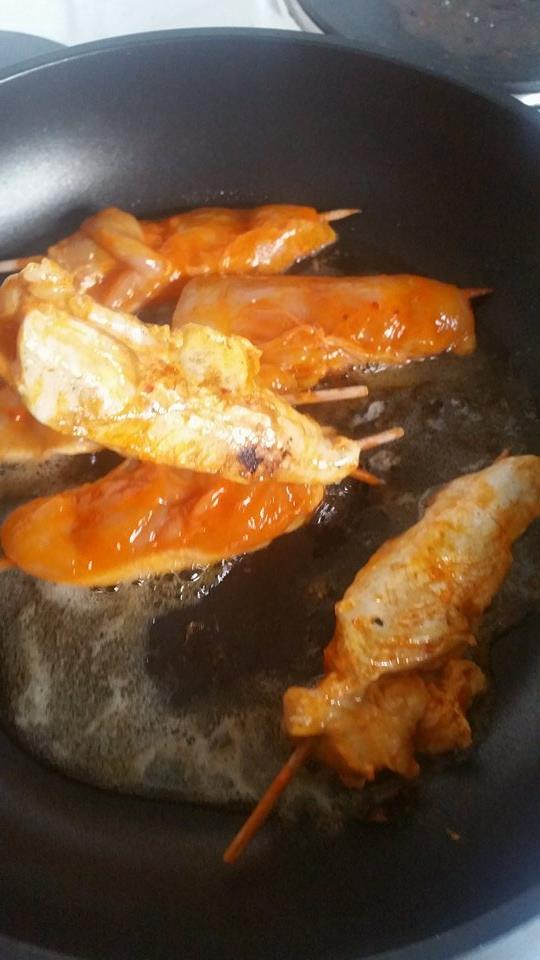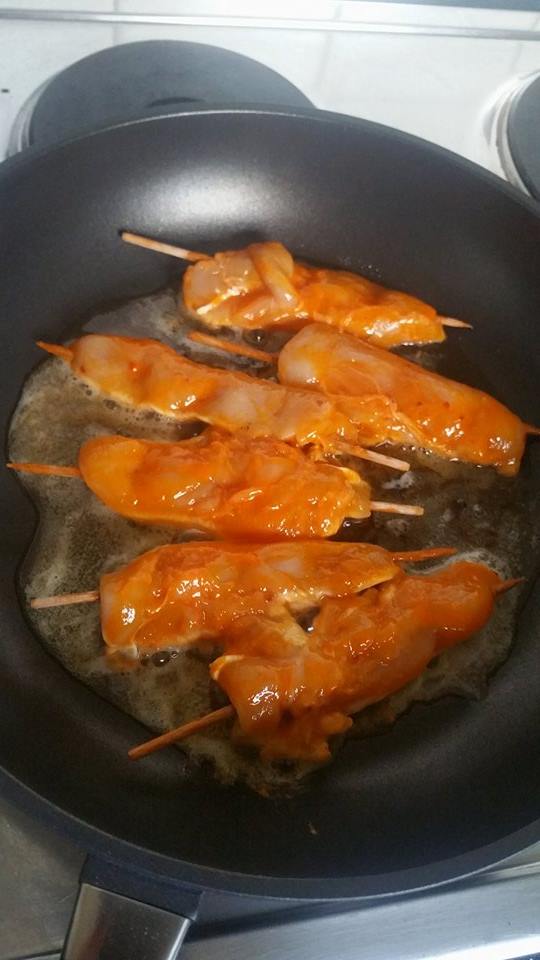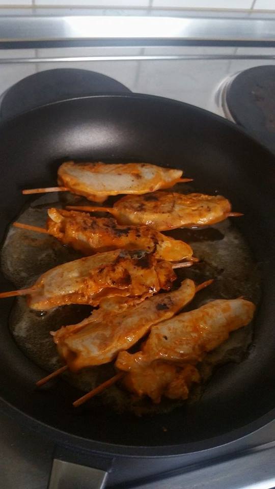 Die Bratpfanne hat es aber dennoch super gemeistert. Als ich dann mal vorbei schaute, um zu sehen wie weit er ist. Habe ich festgestellt dass es nicht so sehr spritze wie erwartet. Das gefiel mir sehr gut. Die Spieße wurden alle gleichmäßig angebraten. Egal ob sie in der Mitte lagen oder am Rand. Trotz geringer Wärme ging das Braten doch recht schnell.