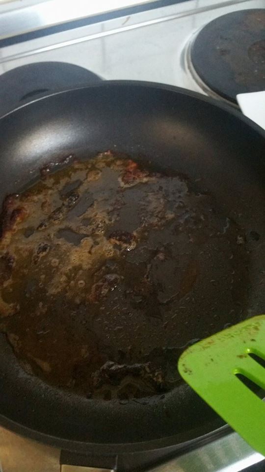 Bei mariniertem Fleisch hat meine alte Pfanne immer verloren und das Fleisch klebte oft an der Bratpfanne. Doch hier konnten wir das Fleisch einfach so raus nehmen. Klar ist etwas angebrannt, dank des vielen Öls aber die Spieße ließen sich ohne Probleme entfernen. Mit den Bratpfannenwender konnte ich es aber einfach so bei Seite schieben. Dann nur noch mit einem Zewa einfach den Rest entfernen. Kinderleicht.