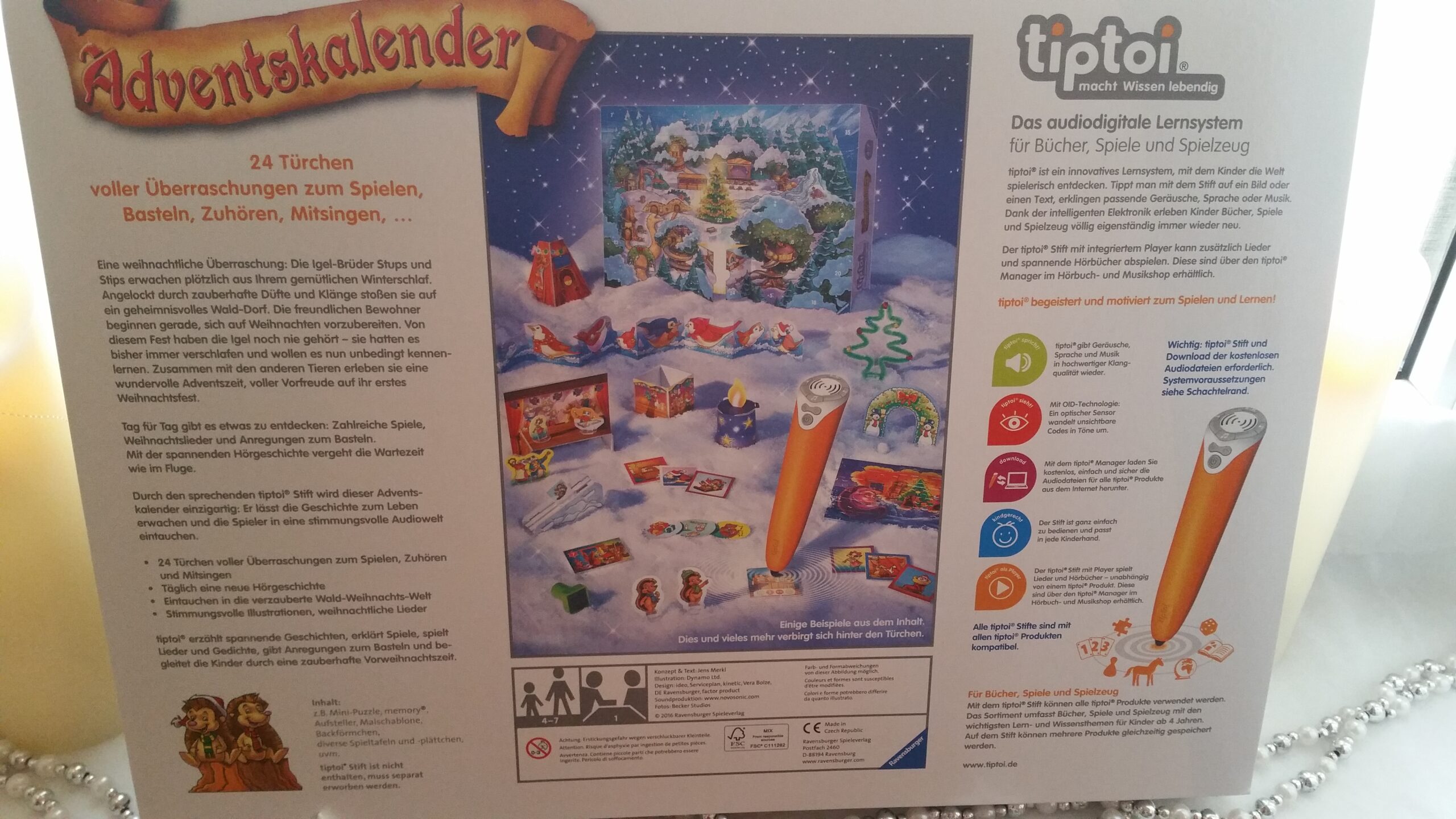 Dieses Jahr handelt der Adventskalender von zwei kleinen Igeln die im Wald leben und vieles Neues zu entdecken haben. Ihre ganze Geschichte wird in 24 Türchen erzählt. Die Kinder werden mit den Tiptoi Stift jeden Tag neu dazu angeregt mit zu basteln, zu spielen, Zu singen, und den Wald zur Weihnachtszeit neu zu entdecken. Diese Geschichte bereitet die Kinder auf eine wundervolle Vorweihnachtszeit vor. Von Gedichten bis Liedern und Backrezepten ist dort alles zu finden. Auch findet man in dem Kalender gleich die richtigen Zubehörteile für die Spiele wie Würfel, Stifte der Ausstechformen zum Backen. Es sind auch viele Figuren von Aufsteller dabei die sich wunderbar als Dekoration für die Kleinen eignen. Kinder werden sich auf jeden Fall darüber freuen Und sehr viel Spaß an dem Adventskalender haben. Viele Fragen und neue Abenteuer werden sich täglich neu ereignen.