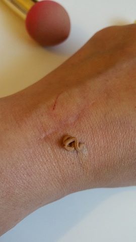 Test und Fazit: Wie bei jeder Kosmetik wir erstmal dran gerochen, denn auch Make Up kann richtig gut riechen. So wie dieses hier. Es riecht keinesfalls chemisch sondern eher sehr leicht. Ich war sehr über die Konsistent überrascht denn ich hatte mit flüssig Make-Up gerechnet. Es kommt dem eines Mousse Make Up sehr nah. Aber auch die Deckkraft und die Masse überraschte mich sehr. Dieser kleine Fleck hat gereicht um mein ganzen Handballen gut abzudecken. Sicher an der tiefe der Narbe lässt sich nichts änder aber es ist deutlich zu sehen das alle Rötungen sowie Adern und Kratzer sind verschwunden. Der Test mit Dermaprof ist hier ziemlich klar und deutlich zu erkennen. Auch im Gesicht ist die Wirkung genial man wirkt sofort frischer und jünger. Es wirkt nicht wie eine Maske und auch nicht beschwerend. Jedoch sollte man beachten das es eher etwas für dunklere Haut ist. Bei meiner Schwester sah es aus wie bei einem jungen Mädchen welches sich das erste mal schminken will. Für mich und meine Haut ist es wie gemacht.