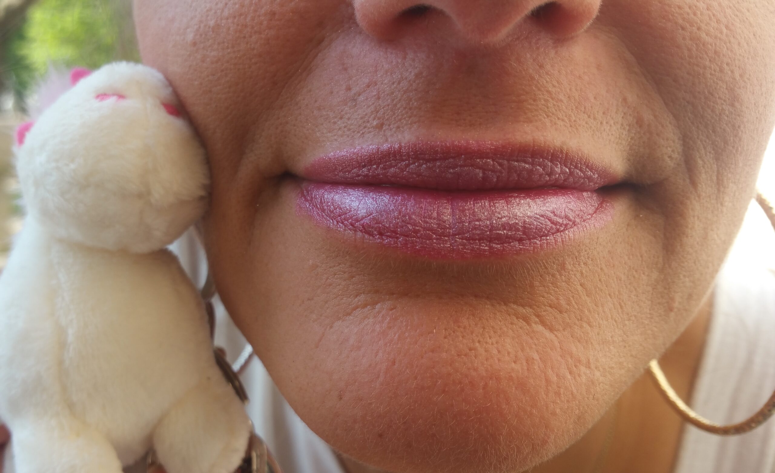 Test und Fazit: Nach dem ersten Test auf meine Hand konnte ich schnell entscheiden dass der Lippenstift für mich viel zu hell ist. Ich bin eher die die immer Rottöne trägt und meine Schwester bei ihr passt Rosé und Goldtöne. Daher musste sie wie immer mal für ein Test herhalten. Was sie auch sehr gerne tat. Der Lippenstift lässt sich leicht und geschmeidig auftragen und brachte nicht gleich am Anfang seine Farbpracht hervor. Erst nach einigen Sekunden schimmerte er Rosa. Wie ihr deutlich erkennen könnt glitzert er ein wenig ich finde ihr steht das wunderbar und der sieht echt toll aus. Sie musste auch kaum nachschminken vielleicht ein oder zweimal aber er war doch sehr intensiv und langanhaltend. Nach dem Tag auf Arbeit, hatte sie es nach dem Abendbrot immer noch noch drauf. Er Krümelte auch nicht so wie einige langanhaltende Lippenstifte sonder wirkte pflegend bei ihr.